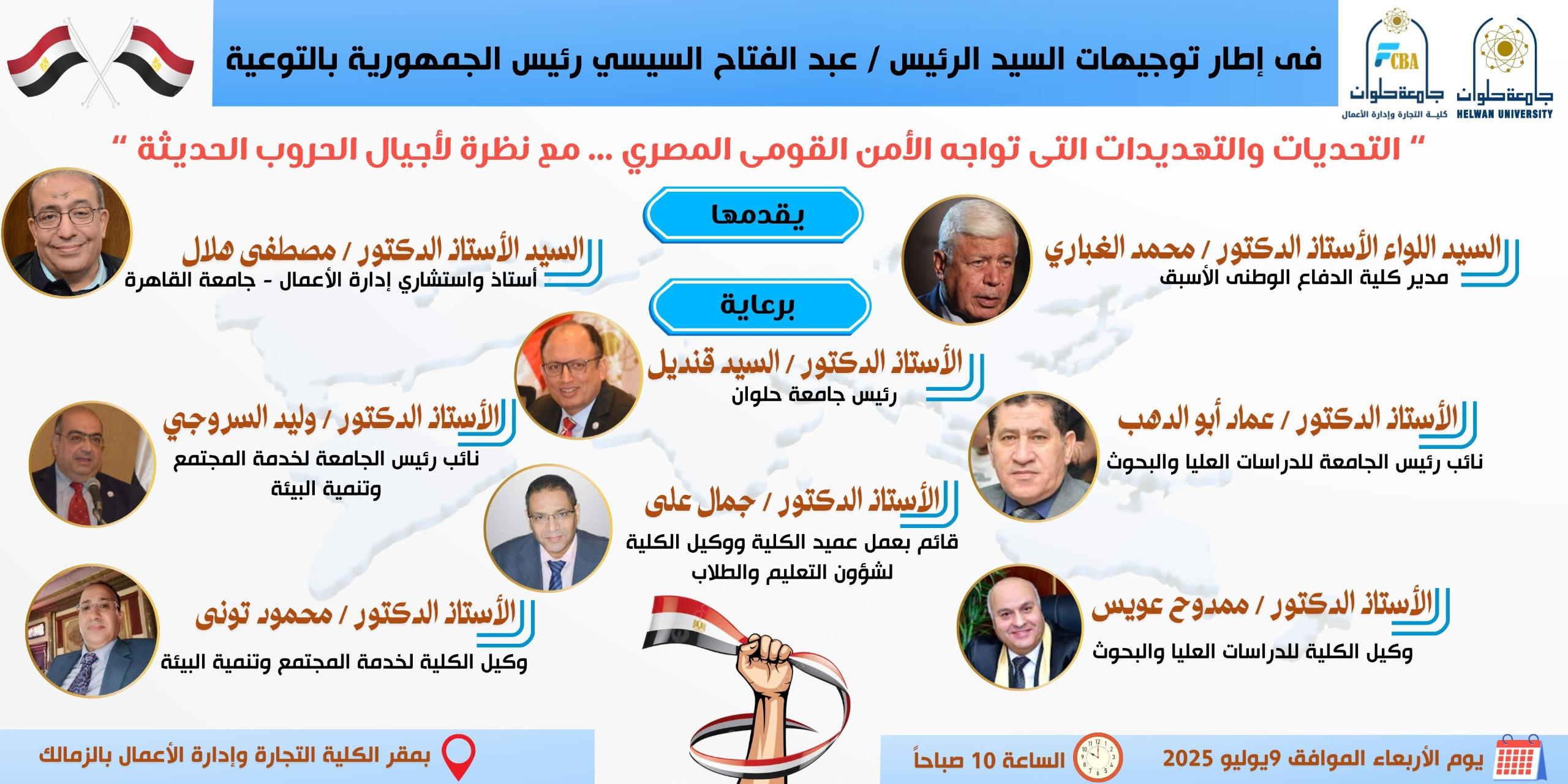 ندوة توعوية بجامعة حلوان بعنوان: "التحديات والتهديدات التي تواجه الأمن القومي المصري... مع نظرة لأجيال الحروب الحديثة"